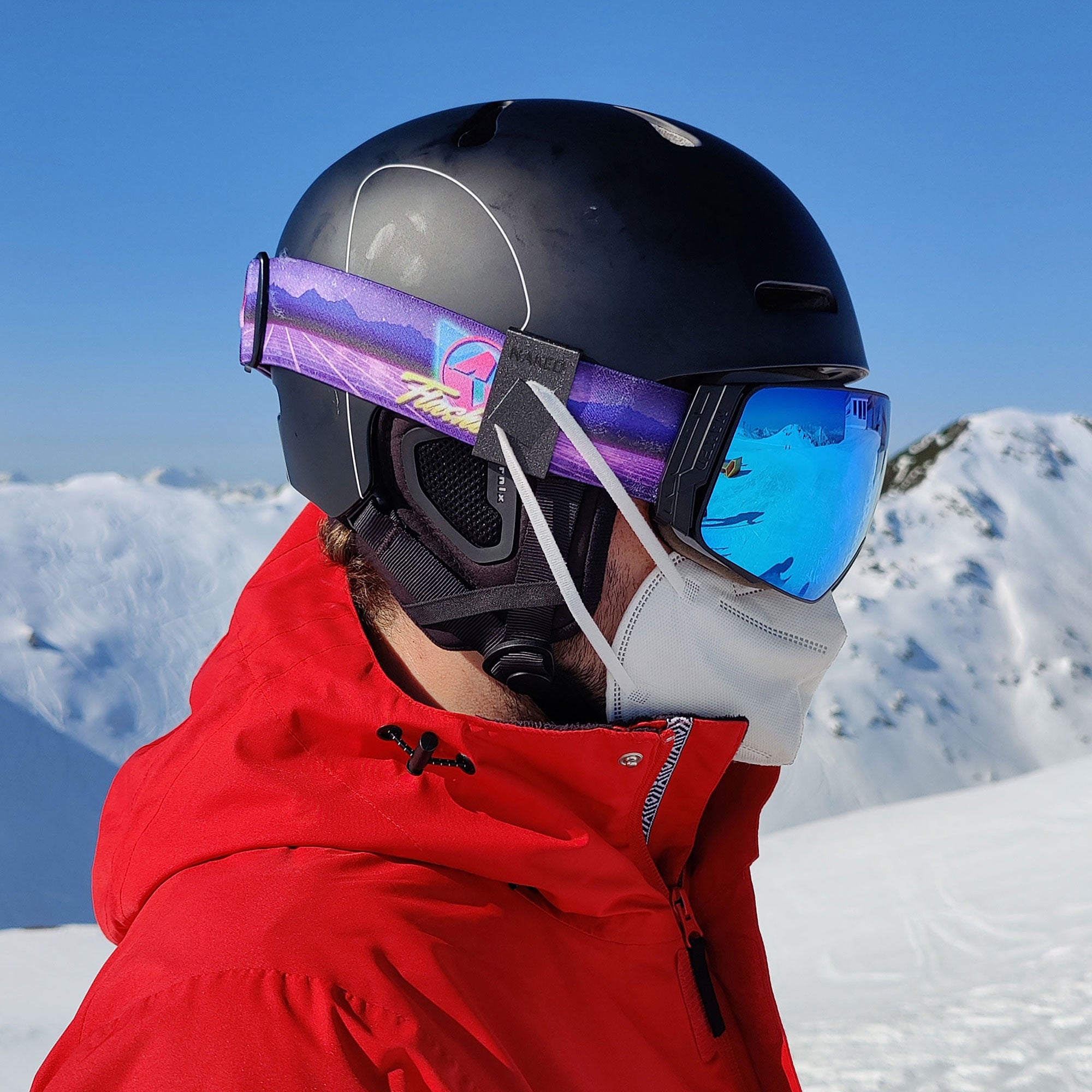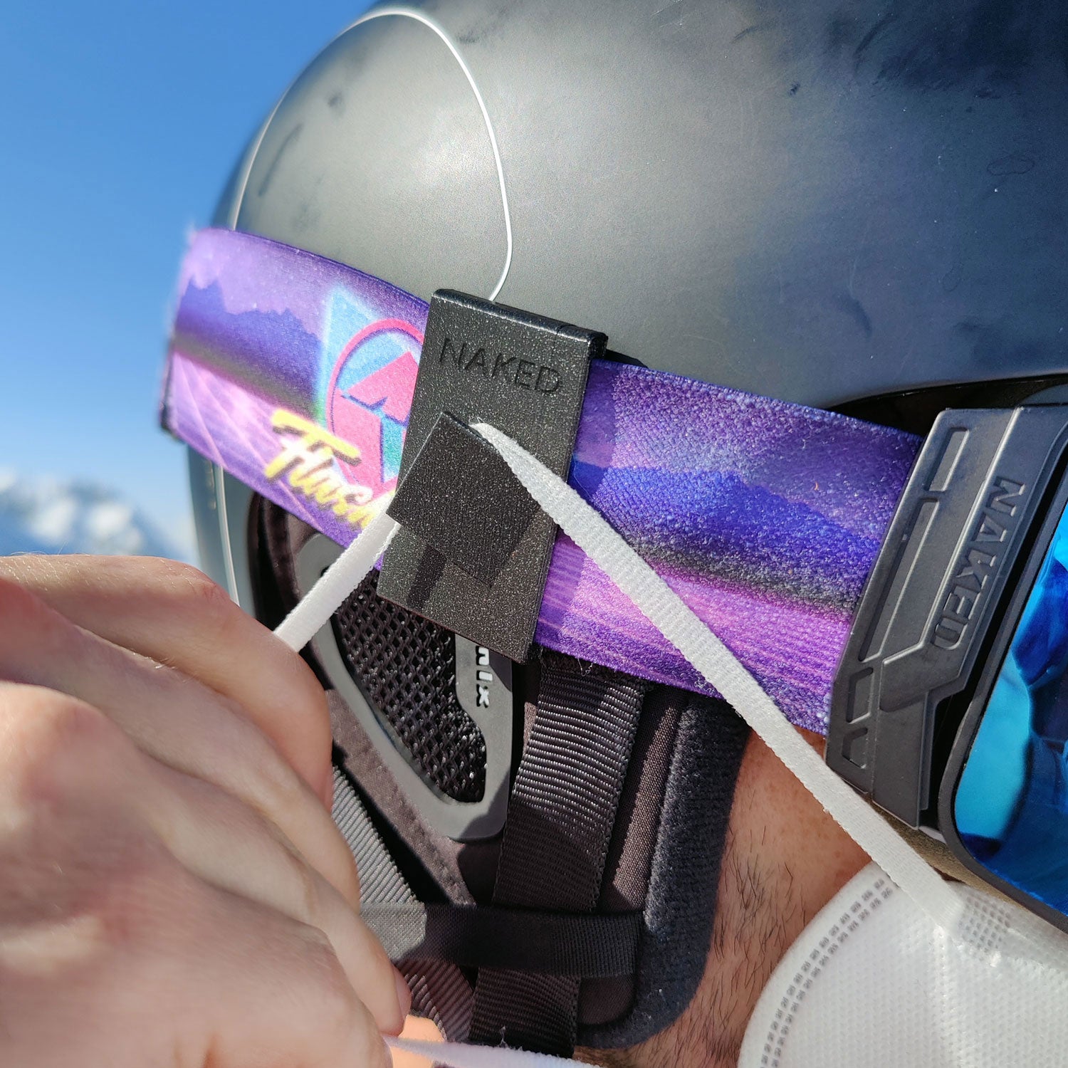 Special circumstances require special solutions . We at NAKED Optics thought the same thing last ski season and came up with a solution for skiing with an FFP2 mask . Our designed mask clips can be quickly and easily attached to the goggle strap and then the mask can be hung up. The annoying and painful twisting of the ears is now a thing of the past. The clips are available in different colors and are a must-have for adventures on the slopes.